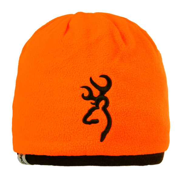 Die BROWNING Deer Scene - Wendehaube braun orange ist beidseitig tragbar und die ideale Kopfbedeckung bei kaltem Winterwetter. Die Außenseite ist in strapazierfähigem Strickmaterial mit eingestricktem Hirschmotiv gehalten, während die Wendeseite aus weichem Fleecematerial in Signalorange mit Browning-Logostickerei hergestellt wird.