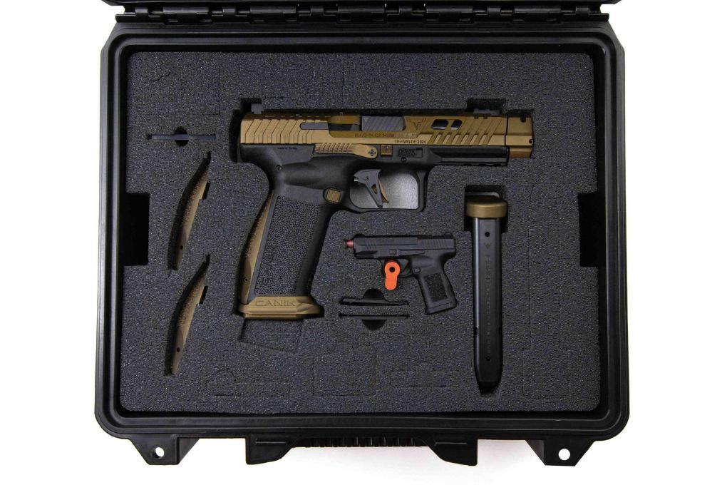 Die CANiK TTI Combat ist eine moderne Wettkampf- und Einsatzpistole, die in enger Kooperation mit Taran Butler entworfen wurde – einem der renommiertesten Action-Schützen der Welt. Ihr speziell entwickelter Polymerrahmen sorgt in Kombination mit dem aggressiven Griff-Design für exzellente Kontrolle auch bei schnellen Schussfolgen. Das Herzstück bildet der geportete Lauf mit Quick-Attach-Kompensator, der die Mündung steil reduziert und das Rückstoßverhalten optimiert. Der 90-Grad-Diamantschliff-Abzug bietet ein präzises und sauberes Trigger-Reset-Erlebnis. Dank des Reddot-Optic-Cuts ist sie sofort bereit für diverse Visiersysteme. Abgerundet wird das Set durch ein maßgeschneidertes Holster, zwei Magazine und einen stabilen Transportkoffer – inklusive Sammlermünze als Symbol der Partnerschaft mit Taran Tactical.
