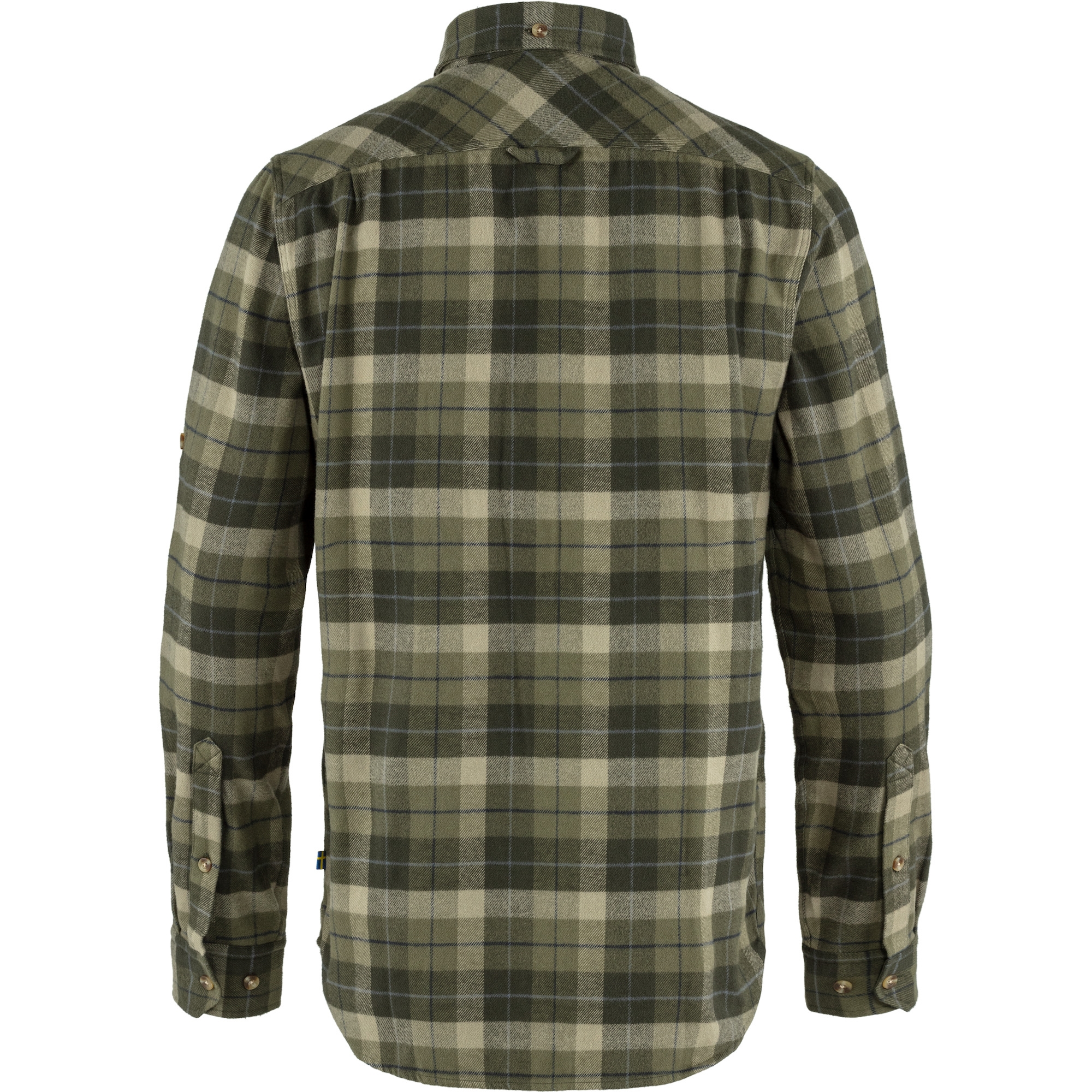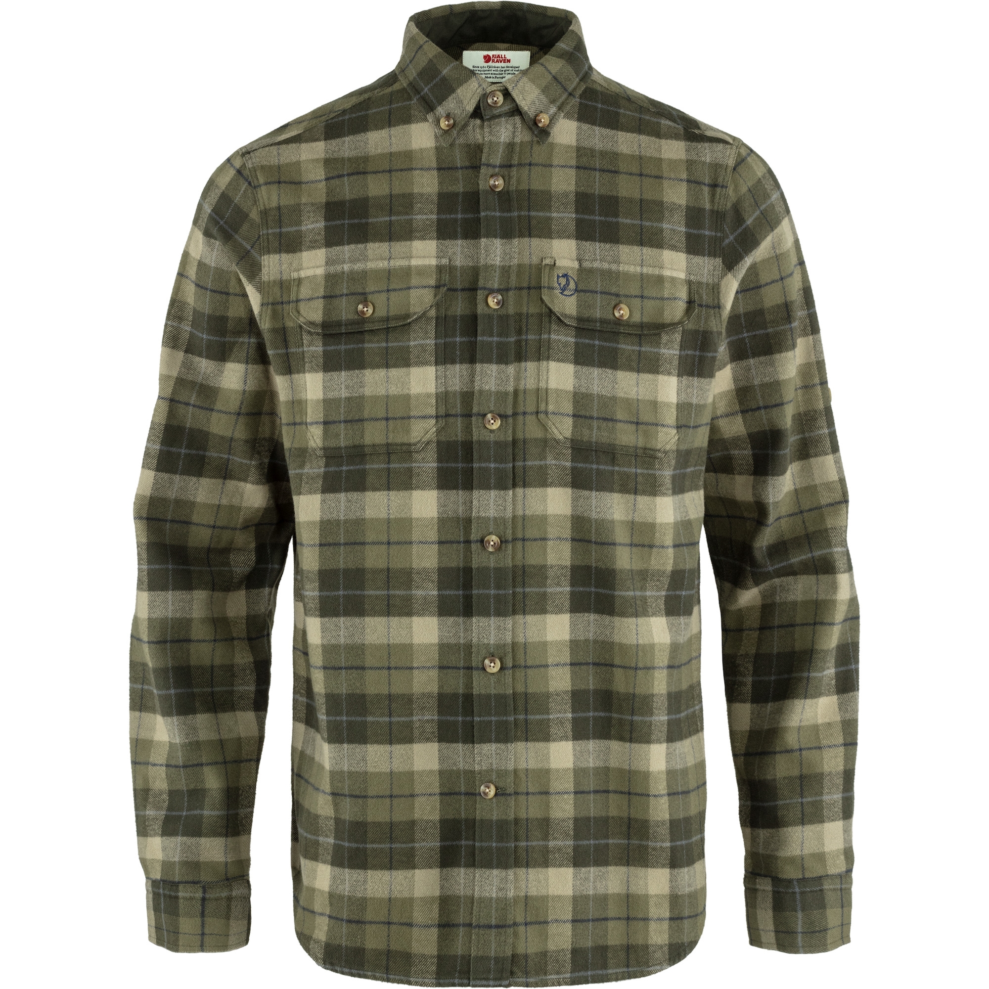 Das FJÄLL RÄVEN Singi Heavy Flannel Shirt ist ein langärmeliges Outdoor-Herren-Hemd mit Button-down-Kragen in normaler Passform. Hergestellt aus weichem Baumwollflanell, verfügt es über G-1000 Verstärkungen auf der Innenseite von Kragen, Manschetten und Taschenpatten.