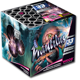 Feuerwerksbatterie Nautilus33 SchussBrenndauer: ca. 30 SekundenEffekthöhe: 50 mKategorie: F2 Die Nautilus Batterie verschießt leuchtintensive Kometen in Blau gefolgt von Schweif-Effekten mit hellblauen Sternen und Goldflimmer sowie großen blauen Sternbuketts ebenfalls mit Goldflimmer, immer im Wechsel.