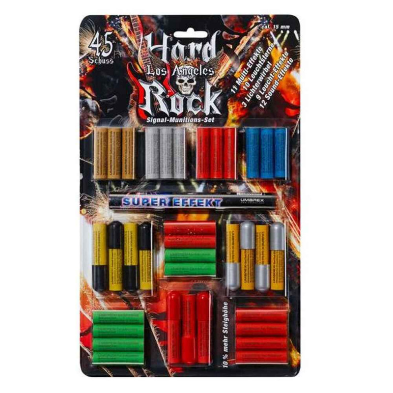 Effektset 15mm Hard Rock LA 45 teilig für den Einsatz in dem Abschussbecher der Schreckschusspistole. 11x Multi-Effekte 10x Leuchtsterne 3x Leuchtwirbel 9x Leucht-Effekte 12x Sound-Effekte Set mit spektakulären Effekte, mit toller Leuchtkraft. Mit zuverlässiger Funktion bei der Verwendung im Abschussbecher einer Schreckschusswaffe.