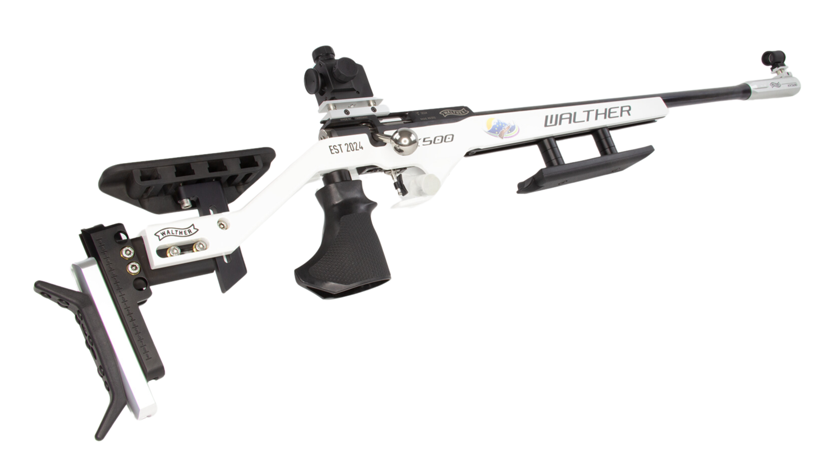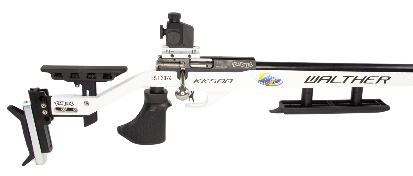 Die WALTHER KK500 Blacktec ist eine hochpräzise Matchwaffe, die ein hervorragendes Preis-Leistungs-Verhältnis bietet. Diese exklusive Sonderedition wurde speziell für das Europaschützenfest 2024 in Mondsee entworfen und besticht durch ihr einzigartiges Design sowie erstklassige Technik. Die Farbkombination aus Weiß und Schwarz mit dem offiziellen Logo des Europaschützenfests macht diese Edition zu einem besonderen Highlight für ambitionierte Sportschützen.