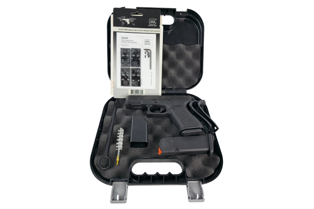 Informationen: "gebr. GLOCK Mod. 19 Gen. 5 MOS im Originalkoffer mit Reservemagazin und orig. MOS-Adapterset, Zustand: Neuwertig, NPR: € 1.020,00"