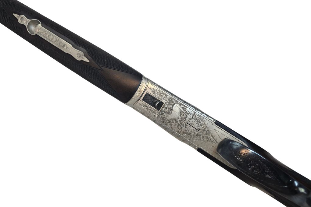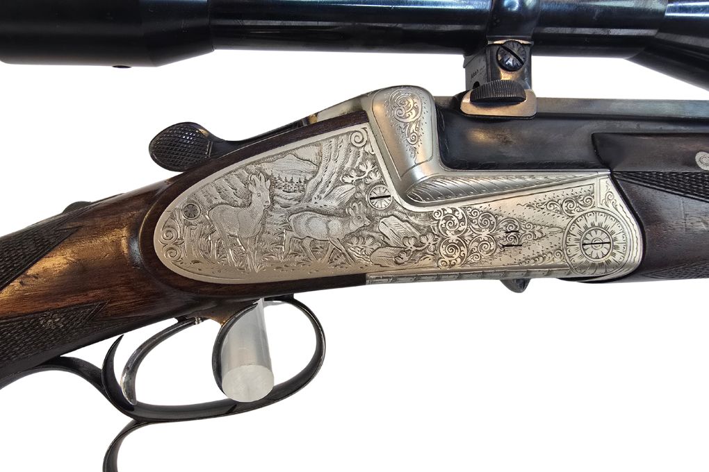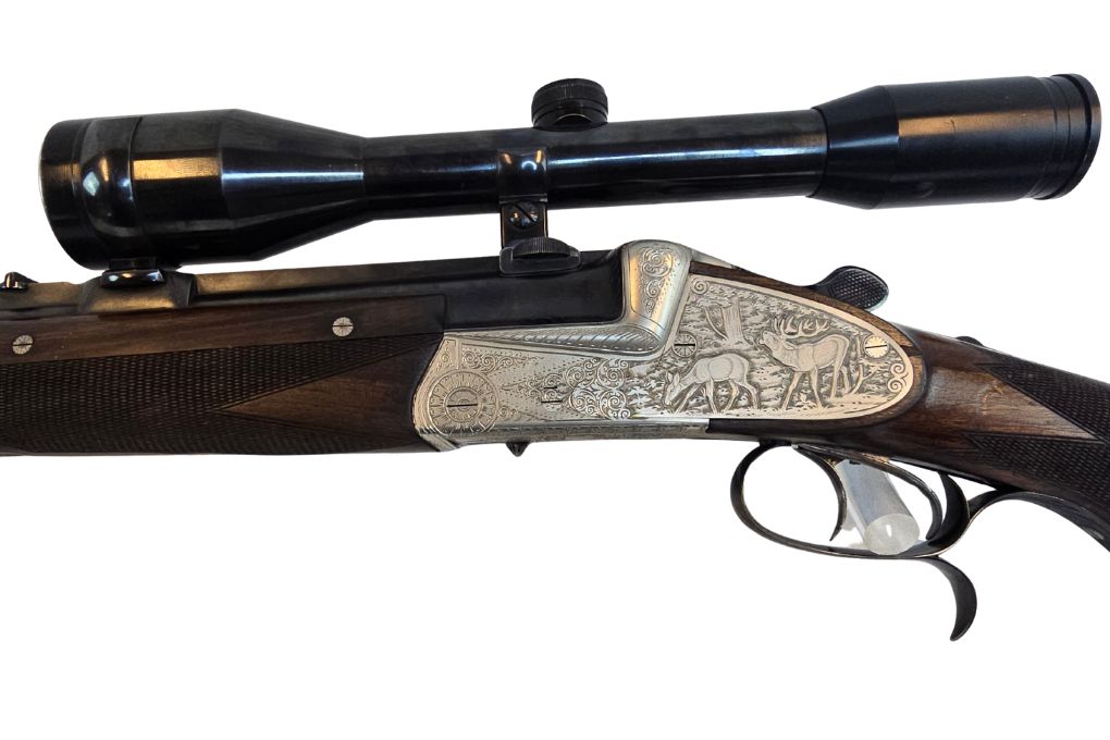 Elegante klassische Bockdoppelbüchse mit langen Seitenplatten, feiner Jagdgravur und Fingerhaken. Die Kombination aus traditioneller Büchsenmacherkunst und montiertem Swarovski 6x42 Zielfernrohr macht diese Waffe zu einer hochwertigen Jagdbüchse für anspruchsvolle Jäger.