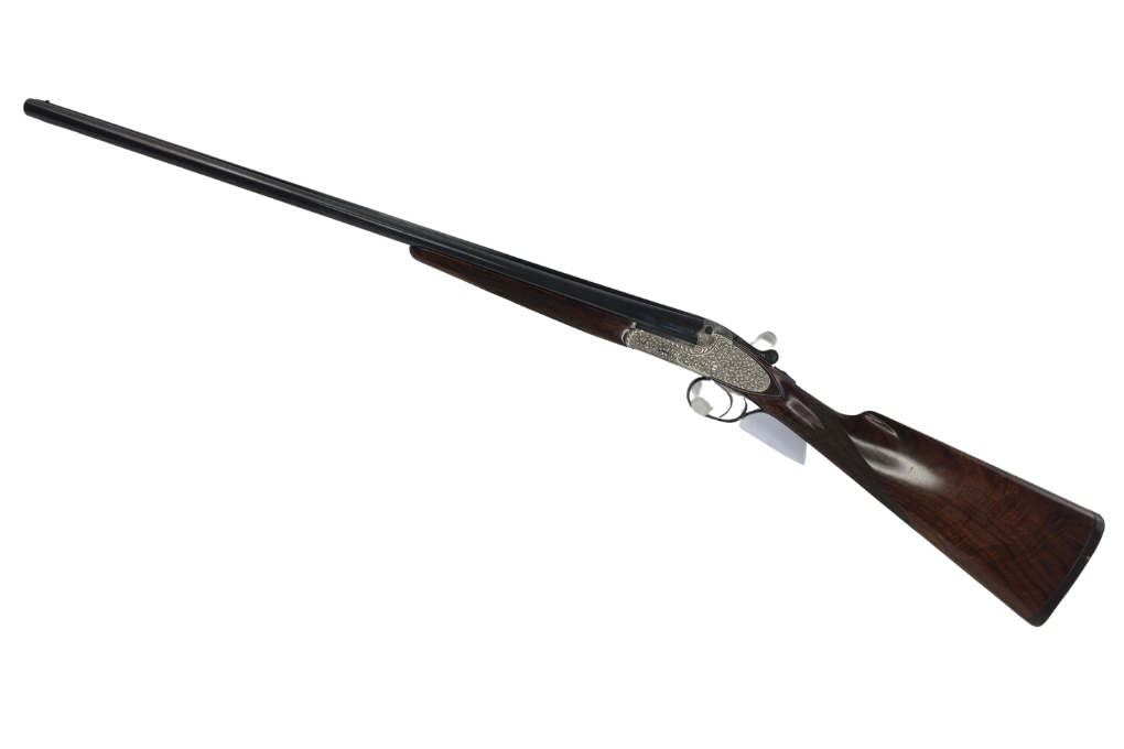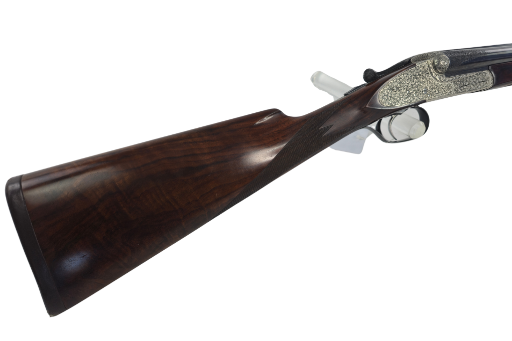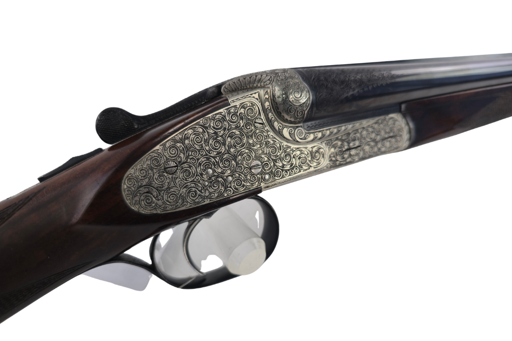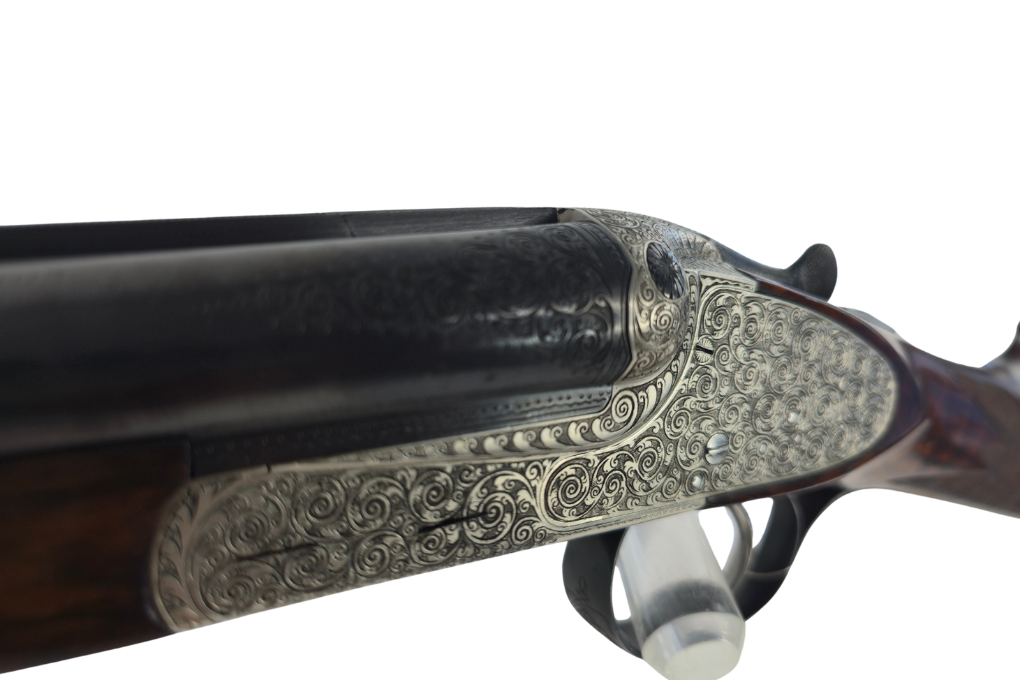 Eleganz trifft auf Handwerkskunst: Diese exklusive Doppelflinte von HUBERTUS mit Seitenschloss begeistert durch feine Arabeskengravur und englische Schäftung. Mit 69 cm Lauflänge, Einabzug und Ejektor ist sie technisch wie optisch ein echtes Meisterstück.