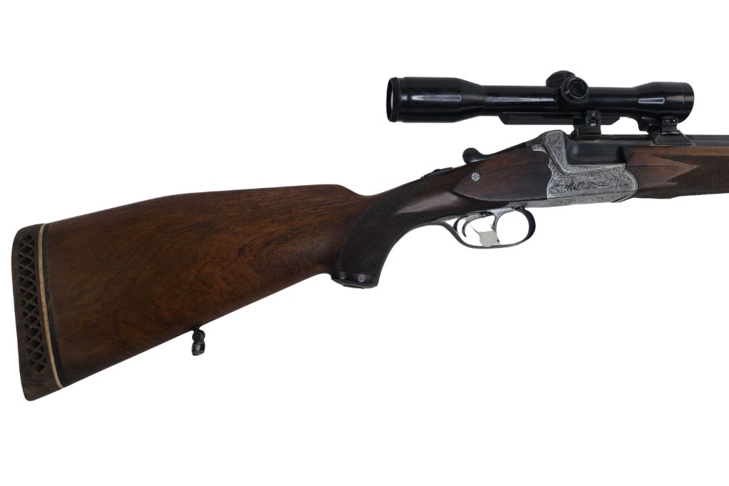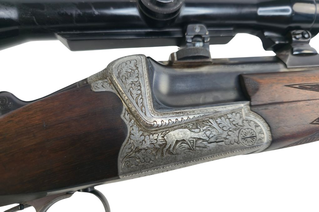 Der Schaft aus dunklem Nussbaumholz mit Fischhaut und Backe sorgt für eine sichere Führung und angenehme Handhabung. Insgesamt präsentiert sich die Waffe in einem guten, gepflegten Zustand und eignet sich hervorragend für Jäger, die eine traditionelle und vielseitige Jagdwaffe suchen.