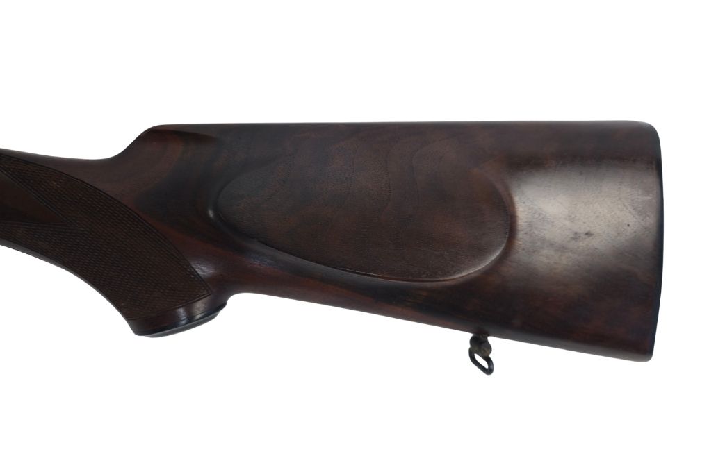 Der edle Nussbaumschaft mit Fischhaut bietet sicheren Halt und eine angenehme Ergonomie. Die fein gravierte Basküle unterstreicht den klassischen Charakter dieser hochwertigen Jagdwaffe.