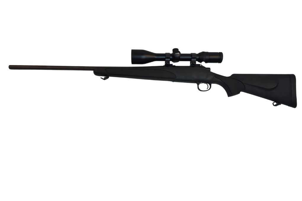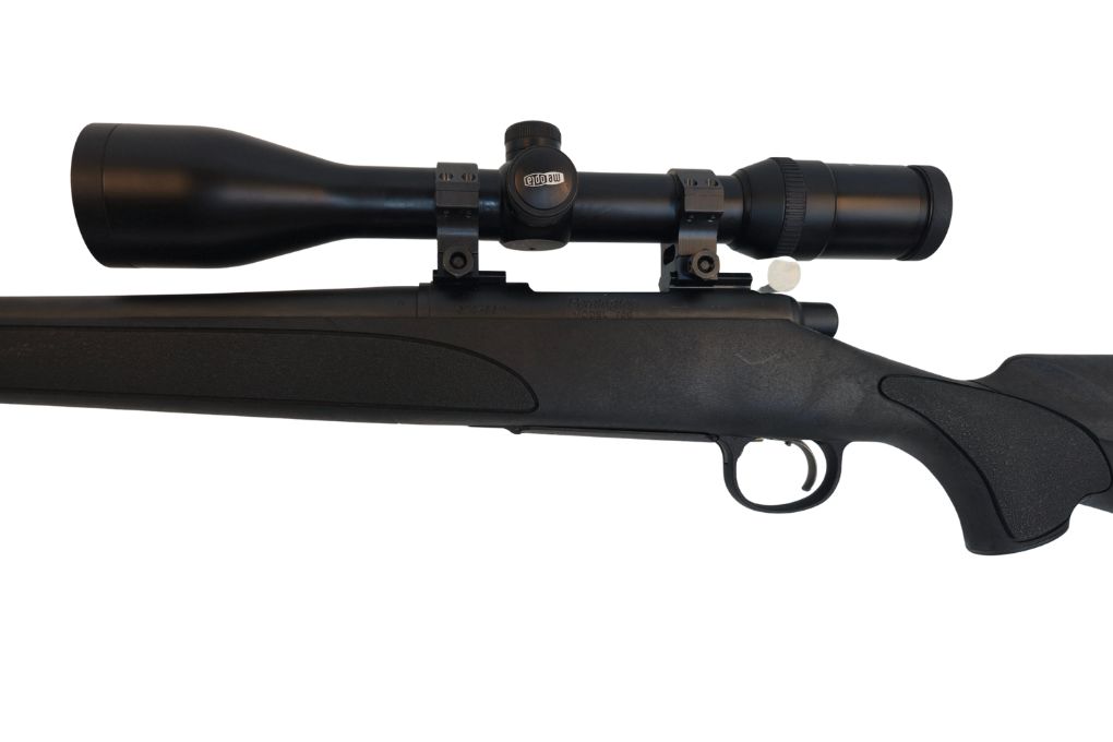Moderne Repetierbüchse von Remington mit Kunststoffschaft und montiertem Meopta Zielfernrohr. Die Waffe ist für den vielseitigen jagdlichen Einsatz ausgelegt und präsentiert sich als funktionales Komplettpaket.