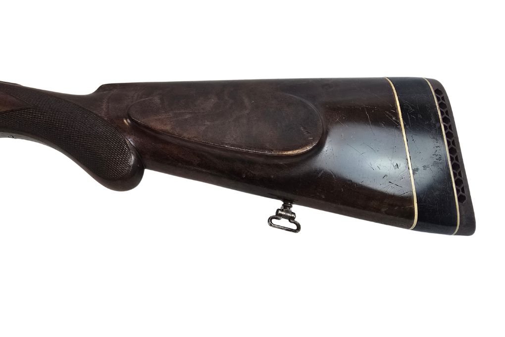 Die Waffe befindet sich in gebrauchtem Zustand mit sichtbaren, alters- und nutzungsbedingten Gebrauchsspuren an Schaft und Metalloberflächen. Insgesamt präsentiert sich die Flinte als funktionales Jagdgerät mit klassischem Charakter.