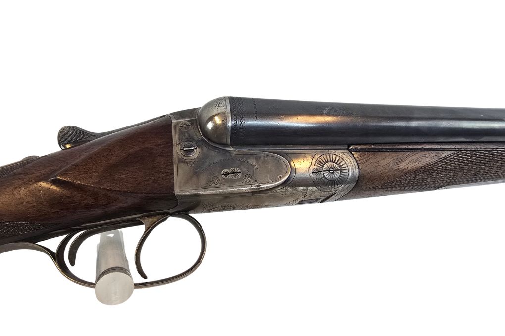 Klassische Doppelflinte von Sauer & Sohn mit Doppelabzug und Auszieher im Kaliber 12/70. Bewährte Seitenschlosskonstruktion in gebrauchtem Zustand – solide Jagdtechnik mit traditioneller Linienführung.