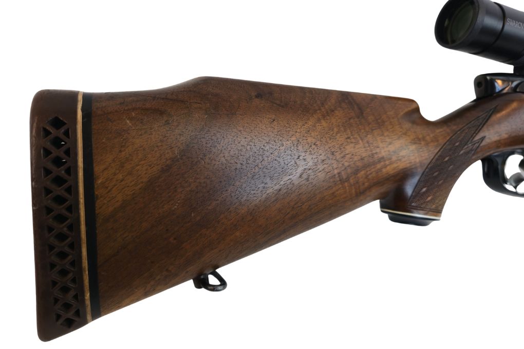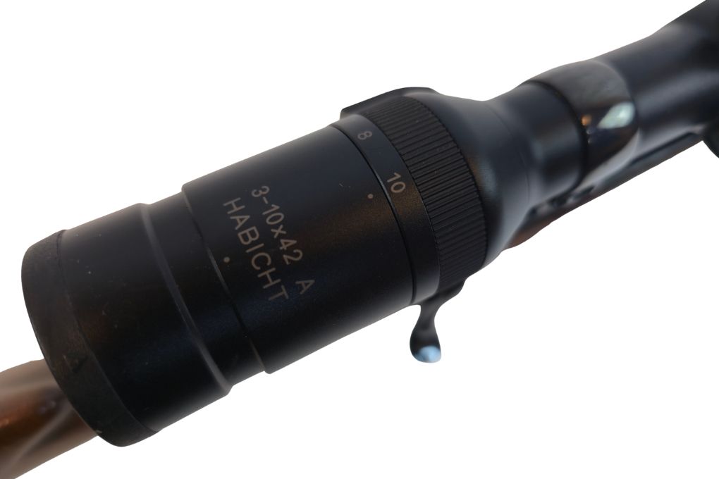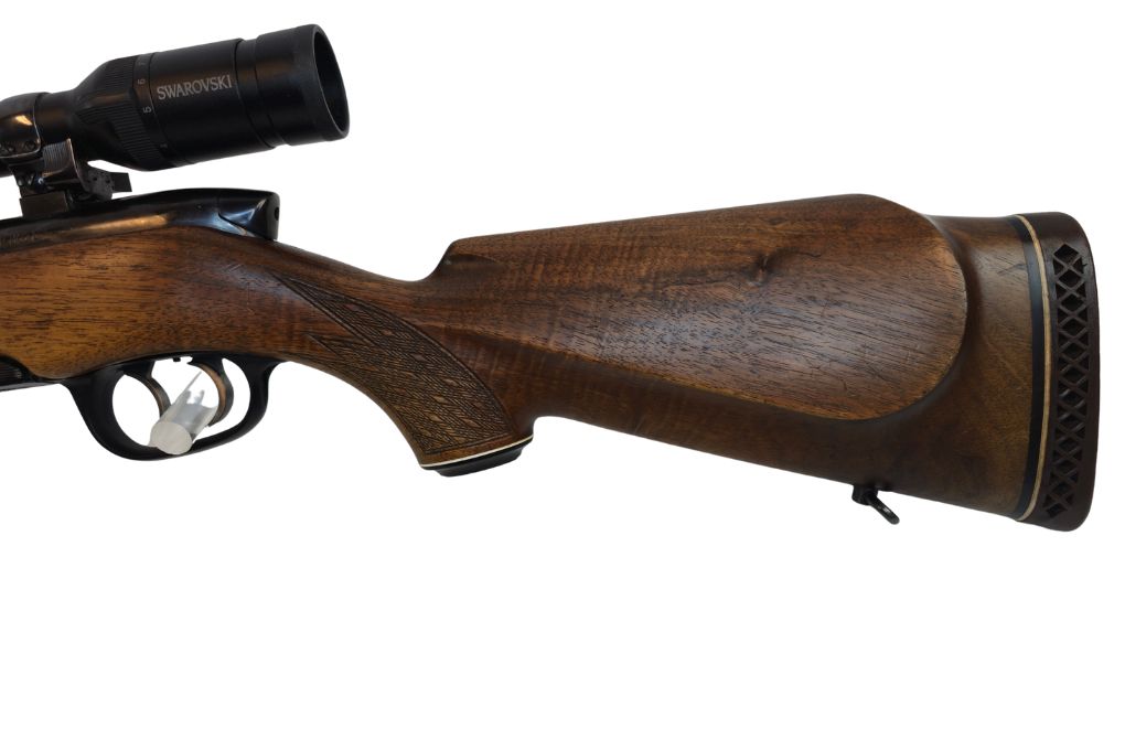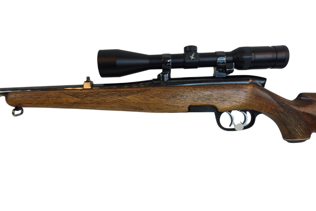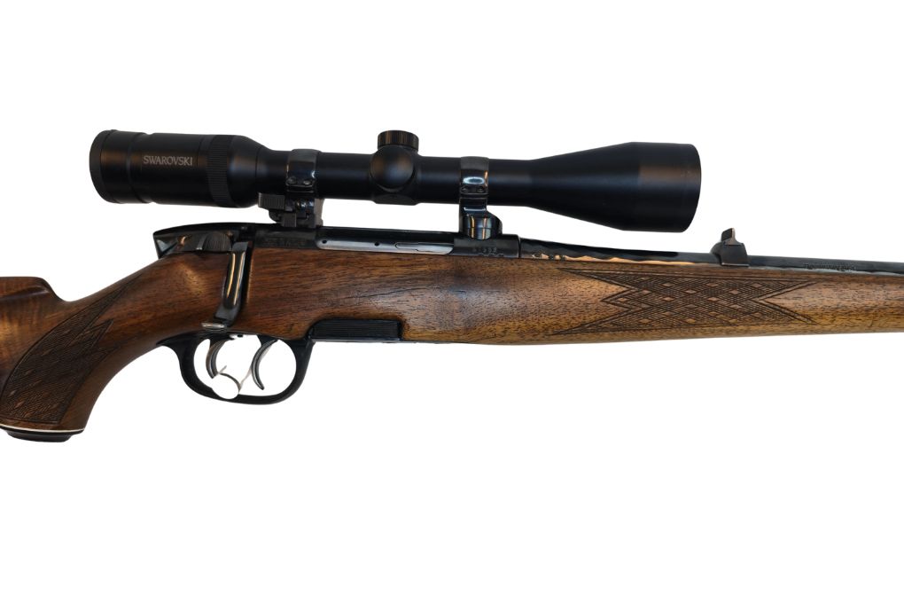Die Steyr Mannlicher Mod. L ist eine elegante Repetierbüchse mit klassischer Linienführung und bewährter Systemtechnik. Der hochwertige Holzschaft mit sauber ausgearbeiteter Fischhaut bietet sicheren Halt und angenehmen Anschlag. Mit einer Schaftlänge von 26,5 cm ist diese Ausführung kompakt dimensioniert und entsprechend führig. Das montierte Swarovski Habicht 3–10×42 A Zielfernrohr ist über die originale Steyr-Mannlicher-Montage befestigt und ergänzt die Büchse ideal für den jagdlichen Einsatz. Insgesamt präsentiert sich diese Waffe als harmonisch abgestimmtes Gesamtpaket.