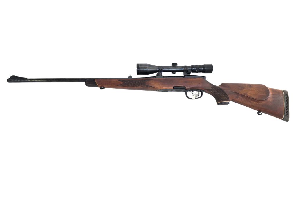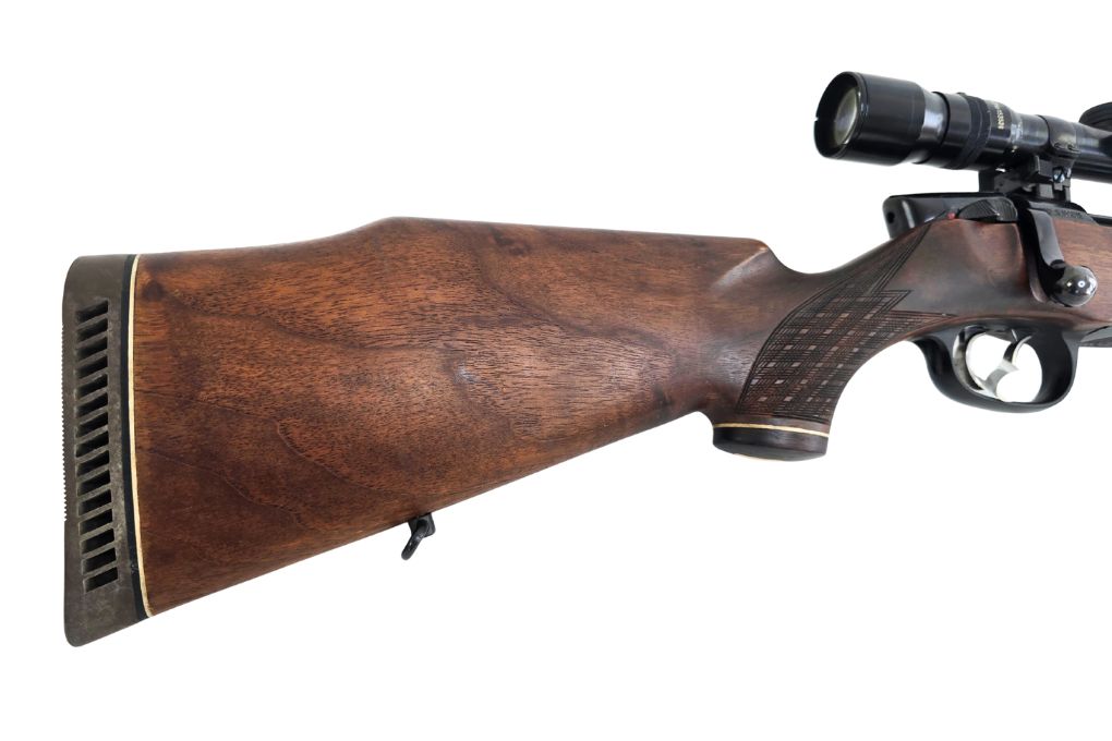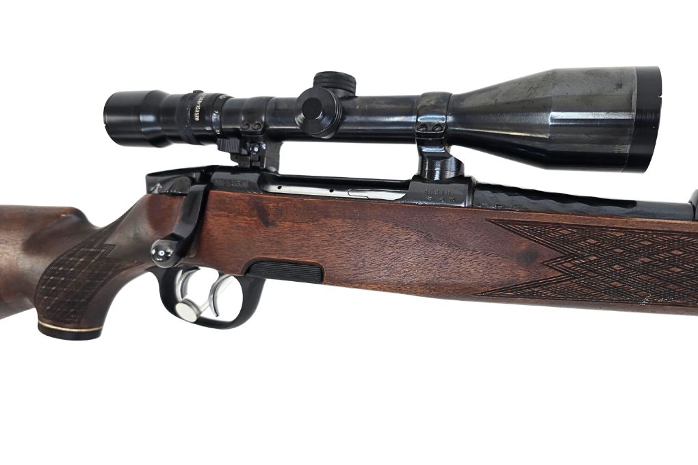 Klassische Repetierbüchse mit edlem Holzschaft und hochwertiger Zielfernrohrmontage. Ausgestattet mit einem Kahles Helia 3-9x42 bietet diese Kombination bewährte Jagdtechnik und präzise Zielerfassung.