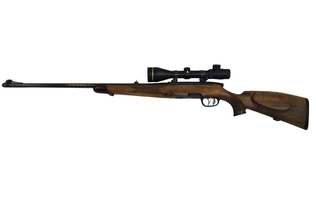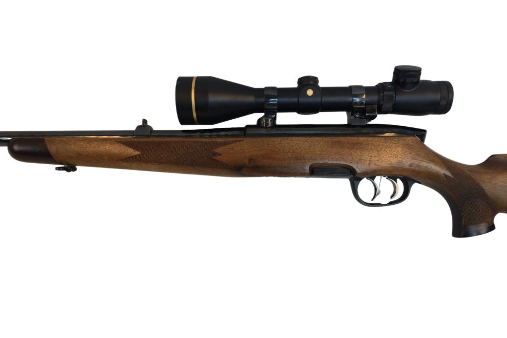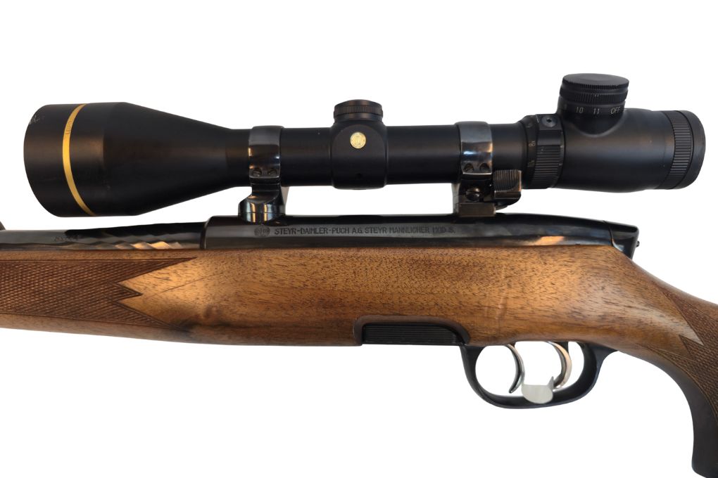 Klassische Repetierbüchse von Steyr Mannlicher mit hochwertigem Holzschaft und montiertem Zielfernrohr Leupold VX-III. Die Waffe befindet sich in einem sehr guten gebrauchten Zustand und ist für die jagdliche Praxis ausgelegt.