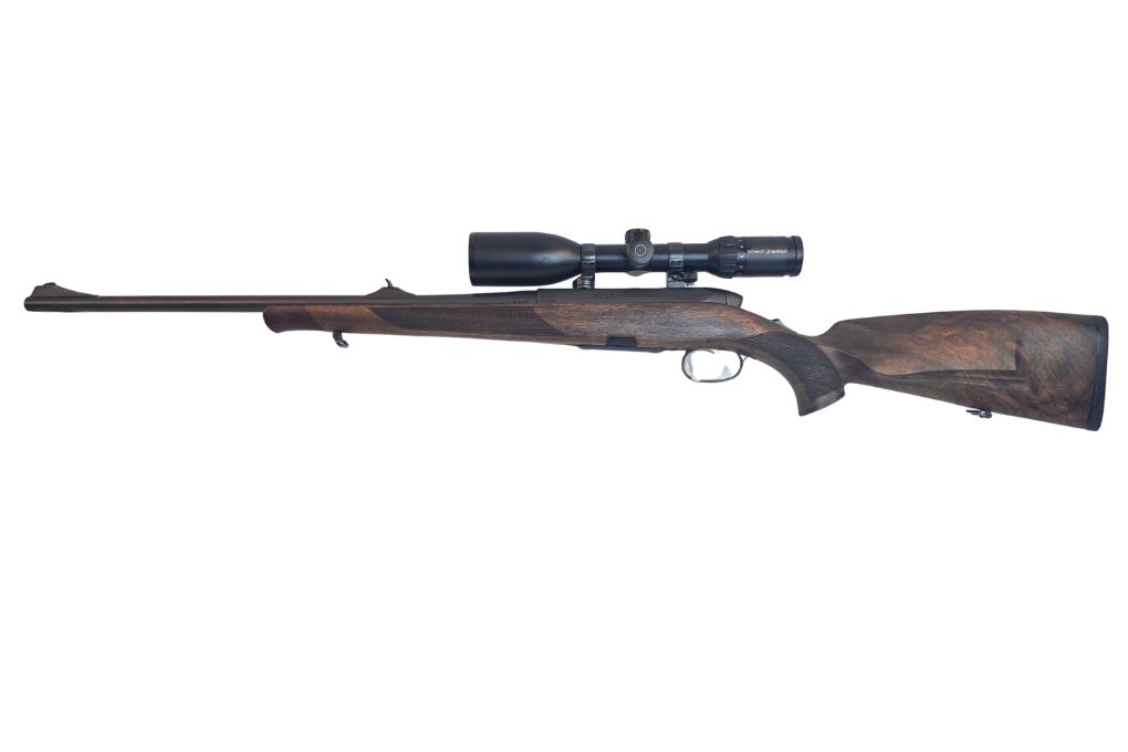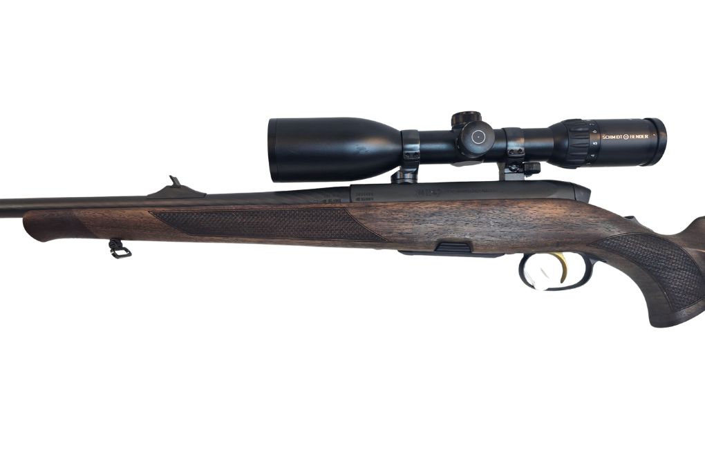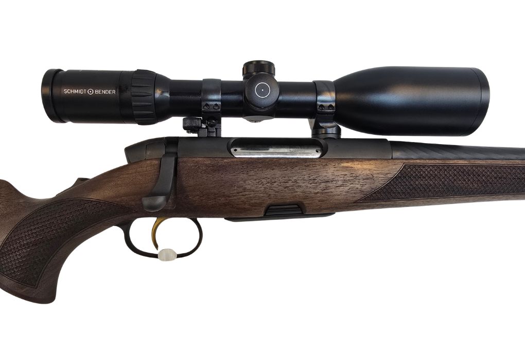 Hochwertige Jagdbüchse aus Österreich mit edlem Holzschaft der Klasse 5 und montierter Premiumoptik. Die Steyr SM12 kombiniert präzise Repetiertechnik mit einem leistungsstarken Schmidt & Bender Zenith 3–12x50 Zielfernrohr mit Absehen 4 und Leuchtabsehen.