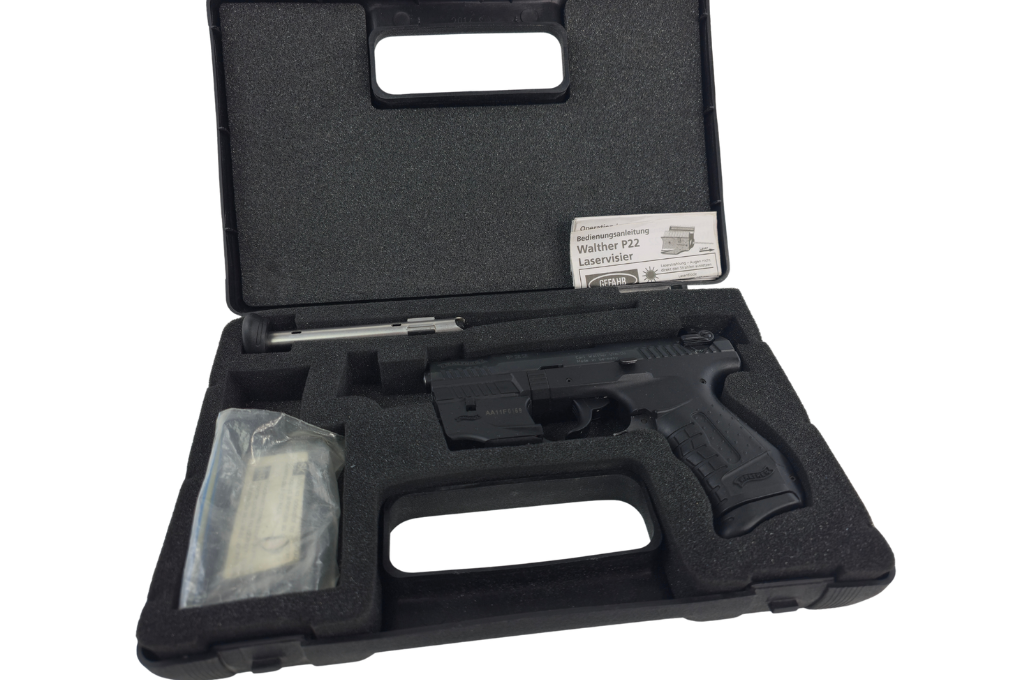 Informationen: "gebr. WALTHER Mod. P22 mit WALTHER Laser im Originalkoffer mit 2 Magazinen, Zustand: Neuwertig, NPR: € 562,00"