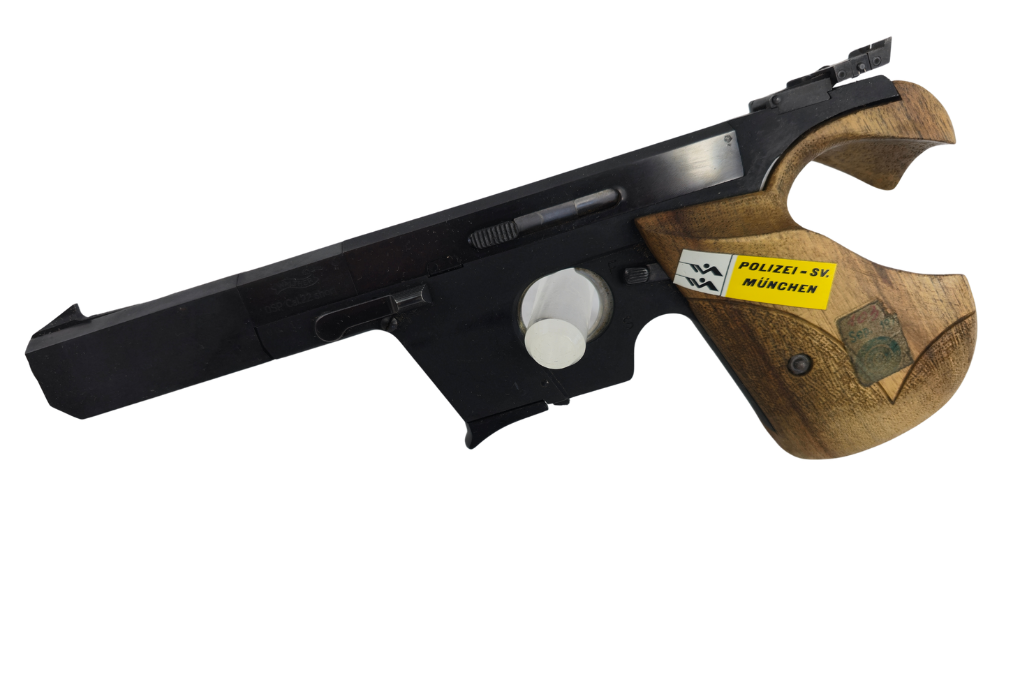 Die gebrauchte Walther OSP Kal. .22 Short ist ein Klassiker unter den Schnellfeuerpistolen und wurde speziell für das olympische Schießen konzipiert. Diese Version punktet mit einem anatomisch geformten Holzgriff, der auch bei schnellen Schussfolgen sicheren Halt bietet. Die Pistole wird inklusive einem Ersatzmagazin sowie einem kompletten Ersatzabzug geliefert – ein klarer Vorteil für Training und Wettkampf. Die Mechanik arbeitet zuverlässig, der Zustand ist gebraucht, aber technisch einwandfrei. Das Modell trägt noch die Kennzeichnung des Polizei-SV München – ein charmantes Detail für Sammler. Diese Pistole ist perfekt für ambitionierte Sportschützen, die ein hochwertiges Einstiegsmodell ins Kaliber .22 Short suchen.