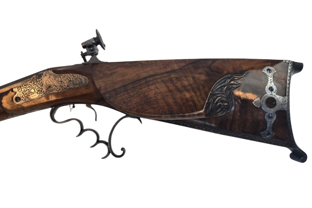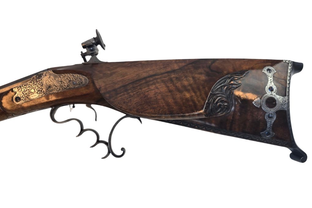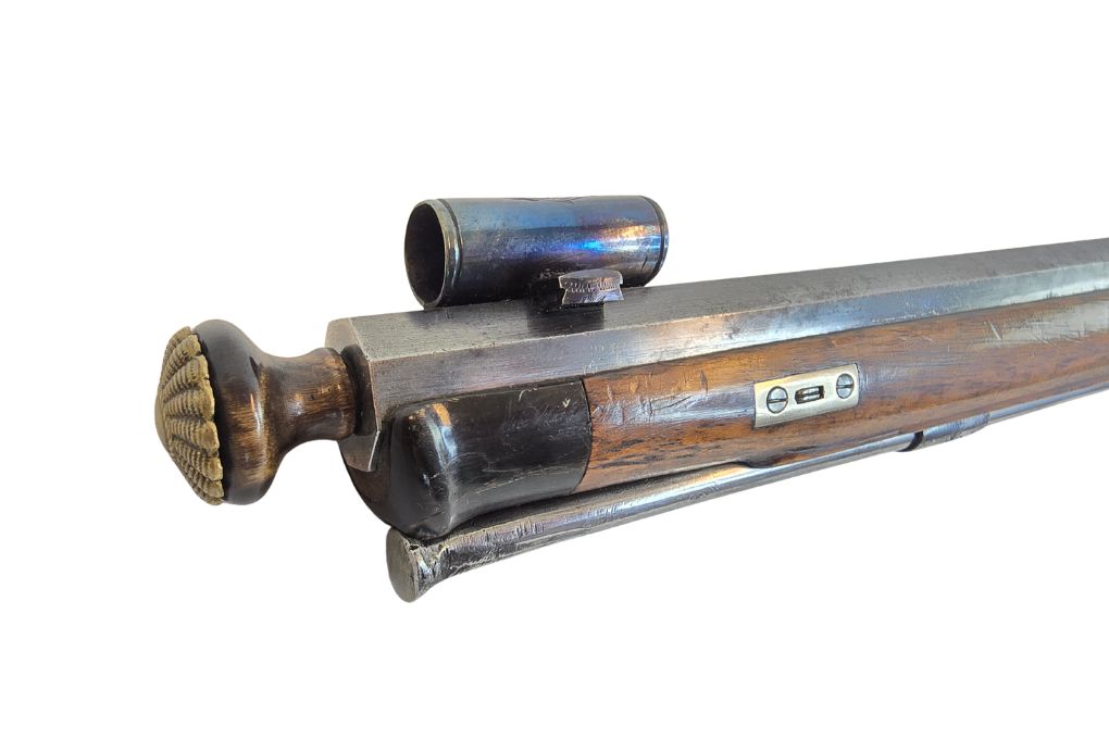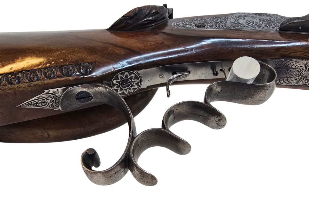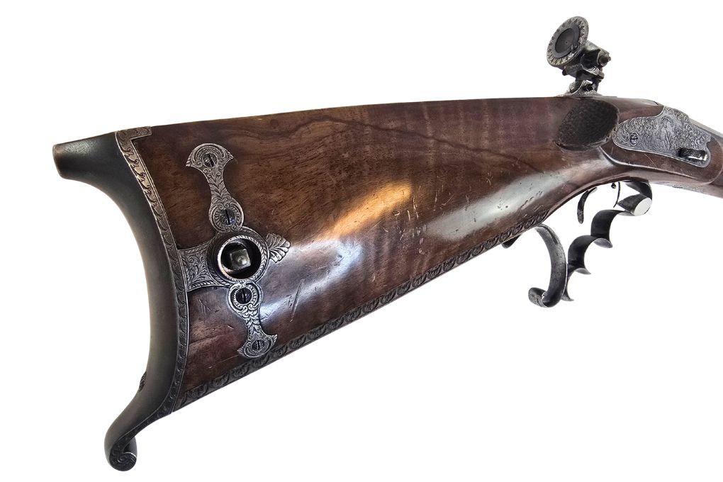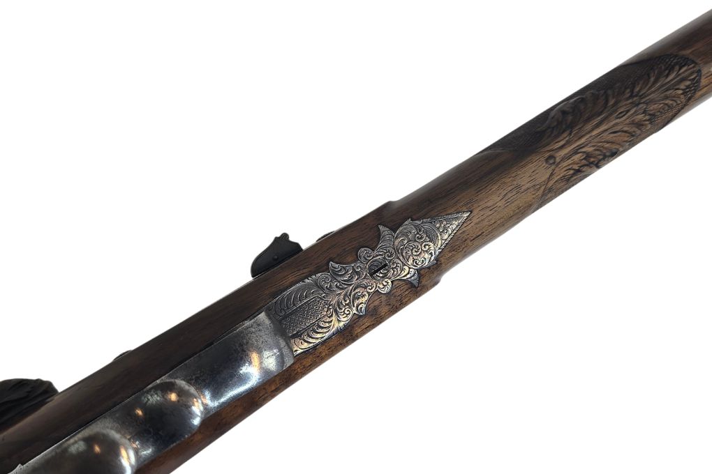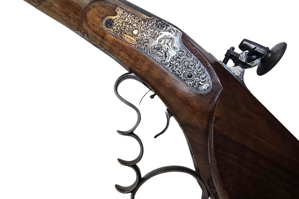 Außergewöhnliche historische Windbüchse aus Wiener Fertigung mit kunstvoll gravierten Metallbeschlägen und reich verziertem Schaft. Dieses Stück verbindet historische Büchsenmacherkunst mit außergewöhnlicher handwerklicher Detailarbeit und stellt ein seltenes Sammlerstück dar.