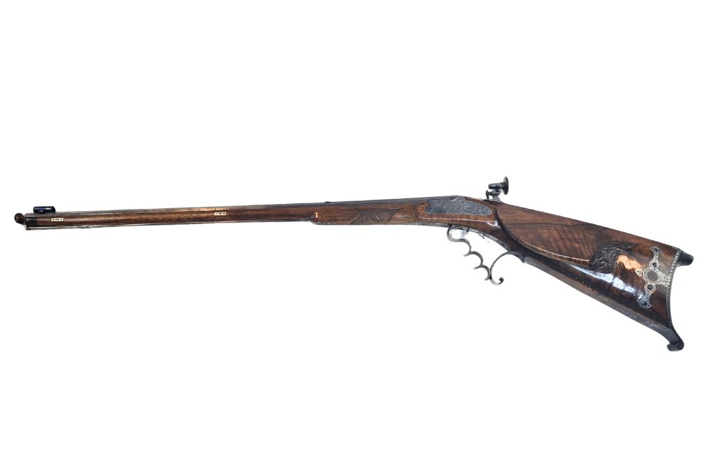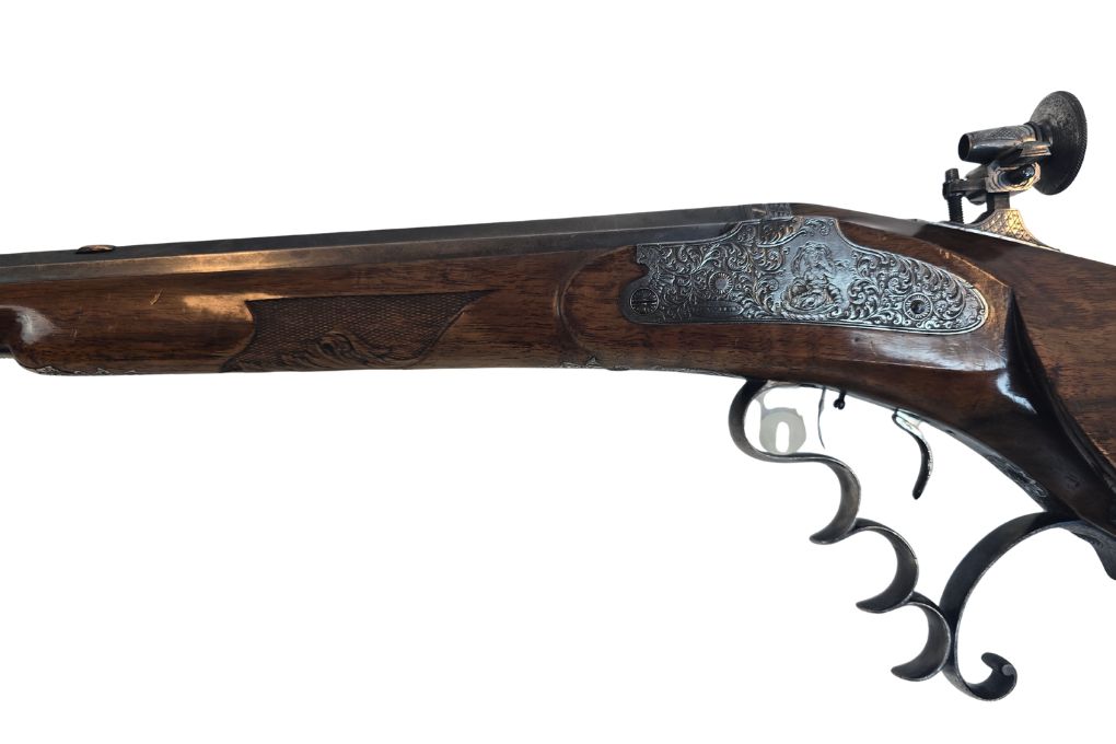Diese Windbüchse aus der Wiener Werkstatt von Karl Pirko ist ein eindrucksvolles Beispiel traditioneller Büchsenmacherkunst. Die Waffe besticht durch ihren kunstvoll gestalteten Schaft mit reich ausgeführten Schnitzereien sowie durch fein gravierte Metallbeschläge und Systemteile. Besonders auffällig sind die dekorativen Applikationen am Schaft sowie die detailreiche Gravur der Schlossplatten. Die charakteristische Abzugsanlage mit mehrfingrigem Abzugsbügel unterstreicht den historischen Charakter dieser besonderen Waffe. Ergänzt wird die Ausstattung durch eine klassische Visierung mit Diopter, die präzises Zielen ermöglicht. Der Zustand der Windbüchse ist gut und macht dieses Stück zu einer außergewöhnlichen Rarität für Sammler historischer Luftdruckwaffen und Liebhaber traditioneller Wiener Büchsenmacherkunst.