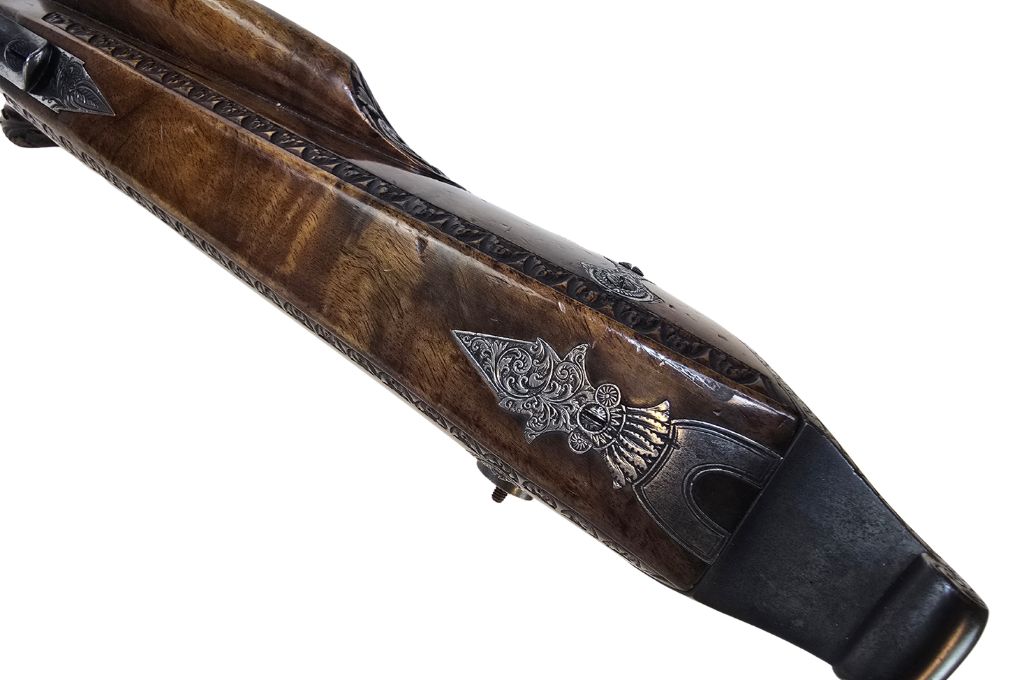 • Aufwendig gearbeiteter Holzschaft mit Schnitzarbeiten