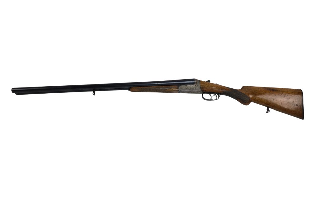 Diese spanische Doppelflinte präsentiert sich in klassischer Ausführung mit zwei nebeneinanderliegenden Läufen. Der Holzschaft zeigt eine schlichte Maserung und ist am Pistolengriff mit Fischhaut versehen, was einen sicheren Halt unterstützt. Die Flinte ist mit einem Doppelauszug ausgestattet und verfügt über Auszieher. Die Basküle ist schlicht gehalten und dezent verziert. Der Zustand ist als gebraucht ausgewiesen. Insgesamt handelt es sich um eine traditionelle Jagdflinte ohne moderne Zusatzausstattung, die durch ihre einfache, bewährte Konstruktion überzeugt.